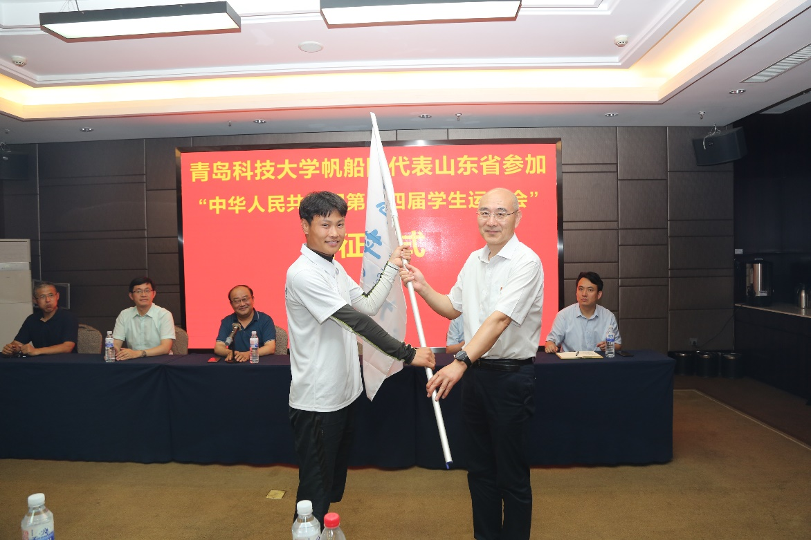 仪式上,陈克正为帆船队授校旗并致辞。他指出,习近平总书记在庆祝中国共产党成立100周年大会上发表了重要讲话,为我们推动学校高质量发展提供了根本遵循,也为我们抓好学校体育综合改革更好落实立德树人根本任务和和构建高水平人才培养体系提指明了方向。学校帆船队征战学运会是体育育人的重要体现。两年来,大家刻苦备战训练,克服疫情影响,取得了不错的训练效果!多年来帆船队教练组和队员们克服各种困难,体现了青科大吃苦耐劳,坚韧不拔的橡胶品格,这就是我们青科大学子应有的气质和精神。顺应学校体育综合改革的号角,依托“课堂+实践+联赛”之课堂平台,持续打造帆船课程——帆船俱乐部——校帆船运动队的竞赛队伍培养选拔体系建设,学校会加强船队的基础条件保障,使帆船队成为“爱体育 兴科大”品牌中最亮丽的名片。你们代表的是学校的形象,是学校学生精神面貌的体现。从国家层面是国家强则体育强,从学校层面是爱体育兴科大。