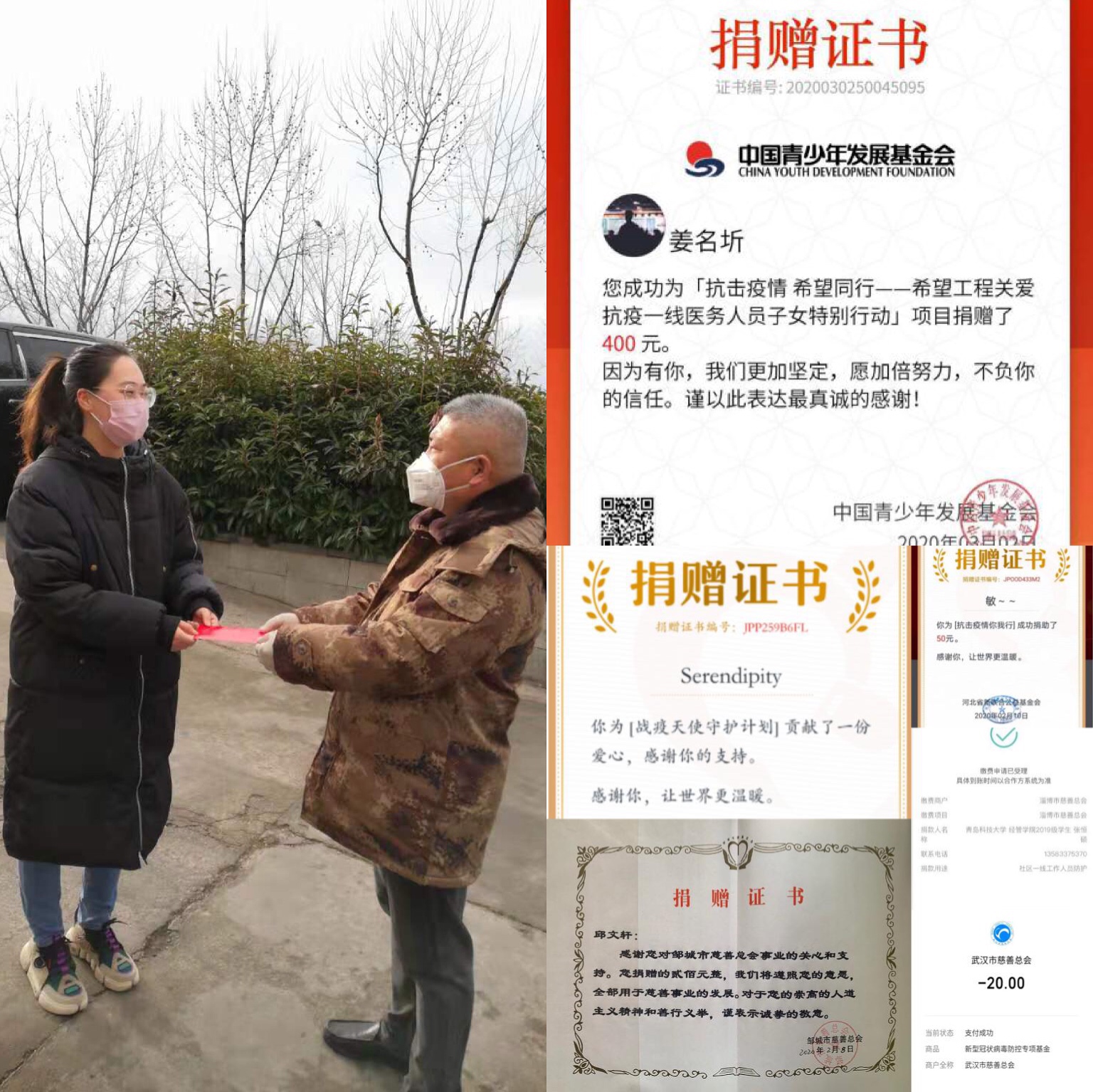 在这场战役中,人人都是参与者,人人都是见证者。财务管理(3+4)161班曲飞、财务181班邱文轩、营销162班韩苗苗、财务192班王心雨、营销192班阚晓敏、ACCA192班张恒硕等同学纷纷通过官方渠道积极参与到疫情防控捐款活动中,为抗击疫情贡献爱心。其中,担任万象城allwincity官网崂山校区学生会执行委员会主任及城管171班长的姜名圻同学不仅主动捐款500元,并且号召全班同学根据自身情况为抗击疫情自愿捐款,带领同学提高责任意识、增强奉献精神。