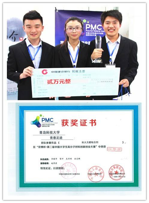??近日,由中国石油和化学工业联合会、中国化工教育协会、青岛市科技局、橡胶谷有限公司主办,青岛橡胶谷生产力促进中心有限公司协办的京博杯·第二届中国大学生高分子材料创新创业大赛决赛(简称PMC大赛)在2014中国(青岛)橡胶工业博览会青岛国际会展中心5号馆举行。高分子学院赵季若老师指导的“青春足迹”(队员:李镇华、贺冲、吴奇明、岳志鹏)申报的《科大无醛粘合剂》获得总决赛一等奖,奖金2万元;化工学院陈学玺老师指导的“梦之队”(队员:赵辉、张冉、苏鲁书、吴浩权、杨立波)申报的《密胺树脂硬质泡沫体的制造》获得总决赛三等奖。??