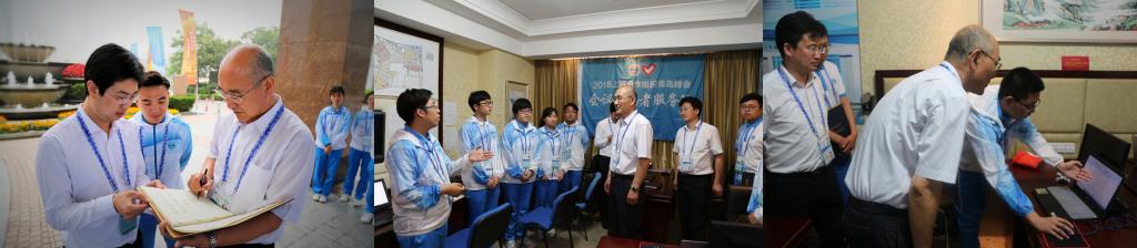 随后,在我校志愿者服务的8家酒店中,陈克正一行来到香格里拉酒店。在场志愿者介绍了他们在安检协助、翻译接待、同传设备保障的岗位职责以及在工作中常常遇到的问题,并展示了部分同传设备和志愿者留言簿。