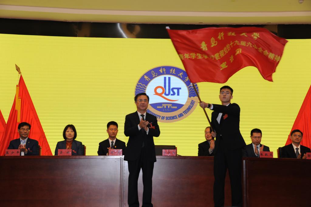 开幕式上,马连湘为学校青年学生学习贯彻党的十九届六中全会精神宣讲团代表授旗。