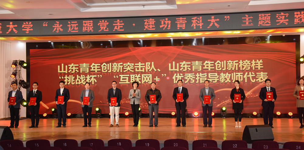 党委副书记张淑华为“山东青年创新突击队”“山东青年创新榜样”和“挑战杯”“互联网+”国赛、省赛项目指导教师代表颁奖。