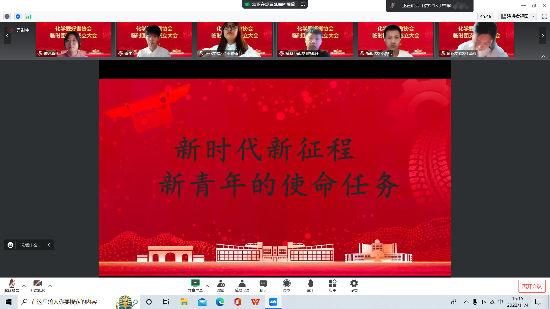 成立仪式结束后,各学生社团开展了“学习二十大 永远跟党走 奋进新征程”和“抗疫有我 时刻准备 青春有为”主题团日活动。化学爱好者协会临时团支部书记丁祥耀表示,临时团支部的成立加强了社团成员归属感和凝聚力,我们学生社团建设起了“想得起、找得到、靠得住”的坚强团组织战斗堡垒。
