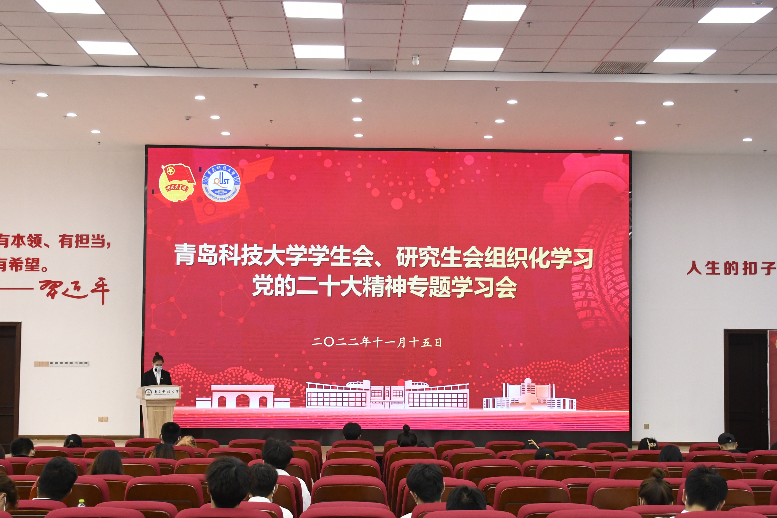 11月15日,学校举行学习贯彻党的二十大精神宣讲会暨宣讲工作动员会,学校党委书记李兴伟作党的二十大精神首场辅导报告。校团委第一时间组织校院两级学生会、研究生会、学生社团骨干以及青马工程学员、团校学员代表分别在崂山校区团学报告厅、四方校区尚舜报告厅同步观看宣讲会,学习李兴伟书记的辅导报告。