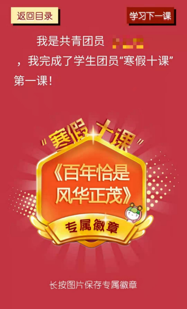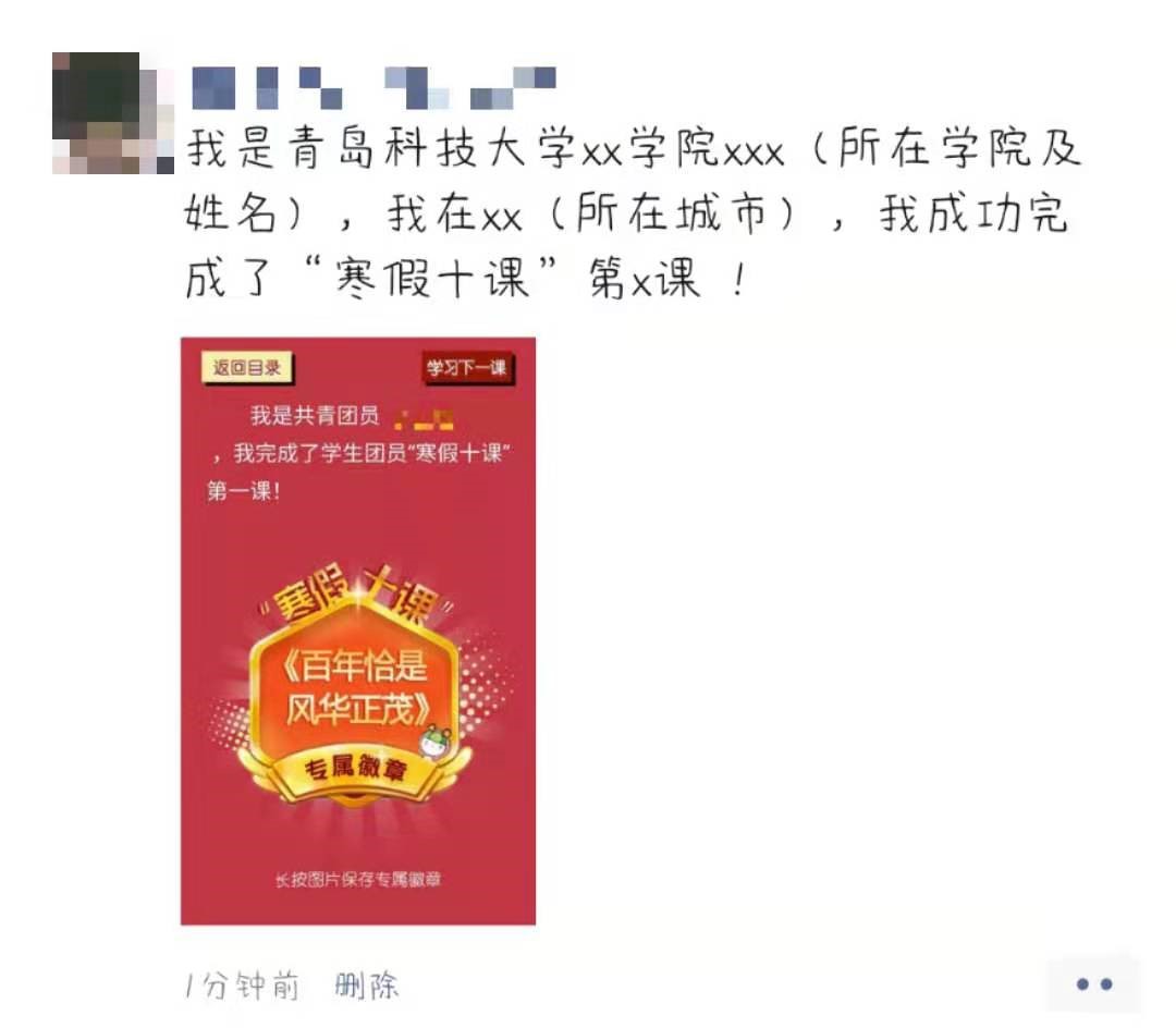 团团建议,全校团支部、各个学生组织要积极参与这场线上“寒假十课”学习活动,号召更多团员青年观看视频学习,发朋友圈并配以下图文,并附加学习感悟及心得体会: