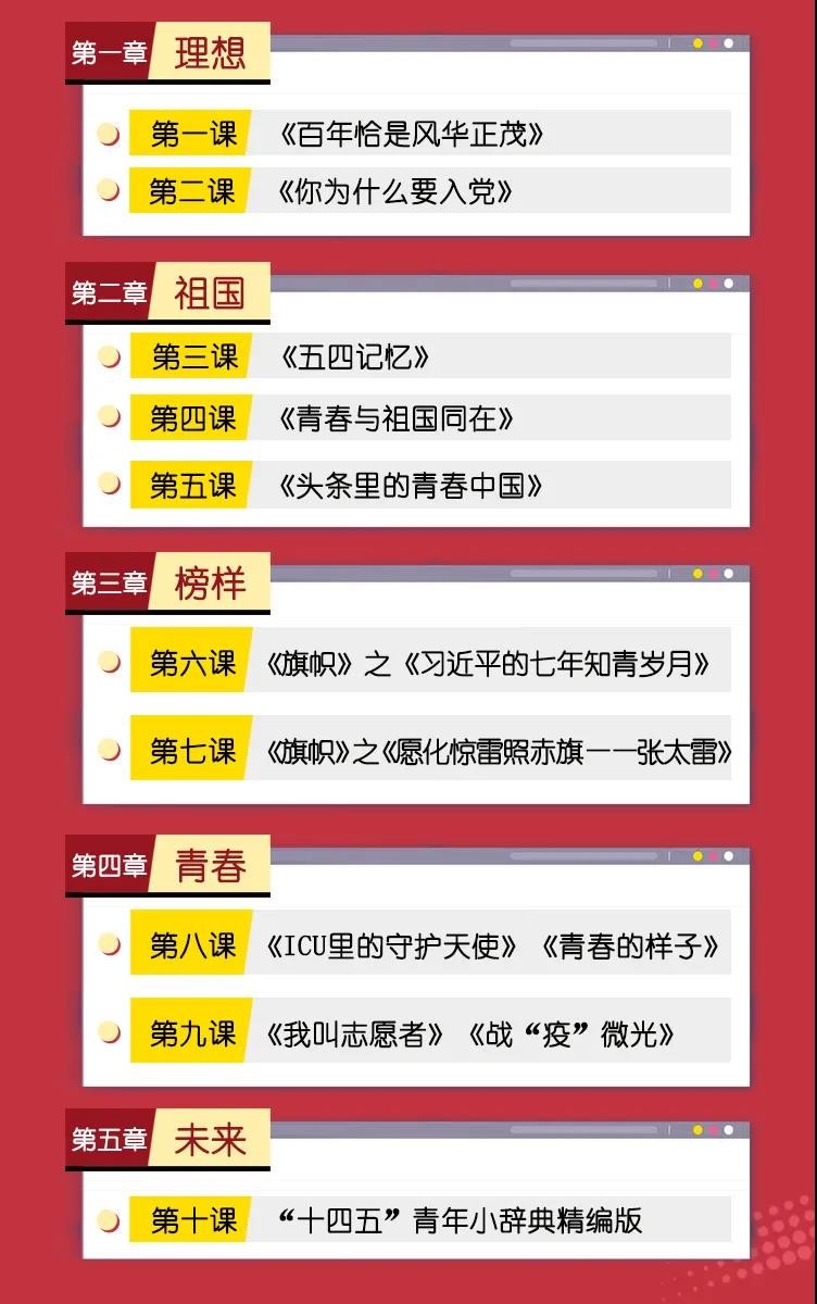 “寒假十课”中的第一章《理想》、第二章《祖国》、第三章《榜样》带领全国青年学生了解伟人典故,树立人生理想,鼓励青年学生在学思践悟的思想下,充分利用寒假时间,通过社会实践接受红色教育,重走红色足迹、追溯红色记忆、访谈红色人物、挖掘红色故事、体悟红色文化,感受党的红色精神伟力。通过成果展示感召更多青年,搭建云上“红色课堂”,将实践成果集锦转化为云上“红色教材”,辐射更多青年突破空间限制、感受朋辈风采、远程红色体验,接受云上红色教育。
