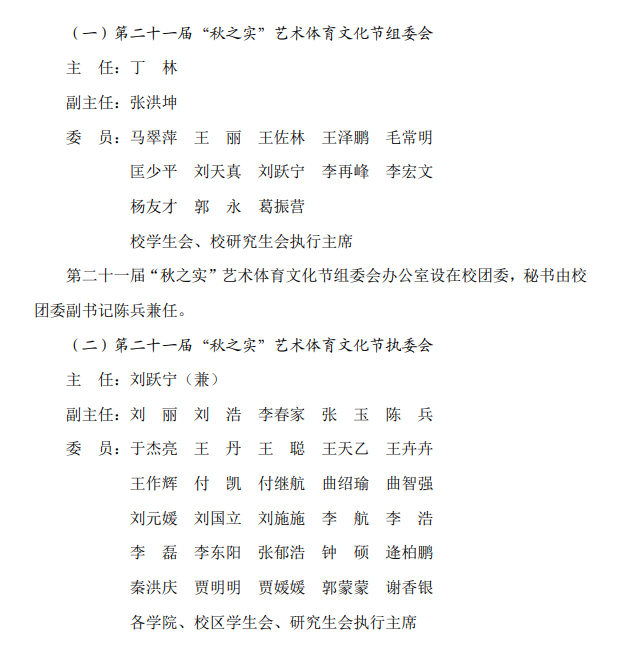 为切实做好第二十一届“秋之实”艺术体育文化节组织、协调、实施、督导等工作,确保活动有序开展,成立第二十一届“秋之实”艺术体育文化节组委会和执委会,具体如下(按姓氏笔画排序):