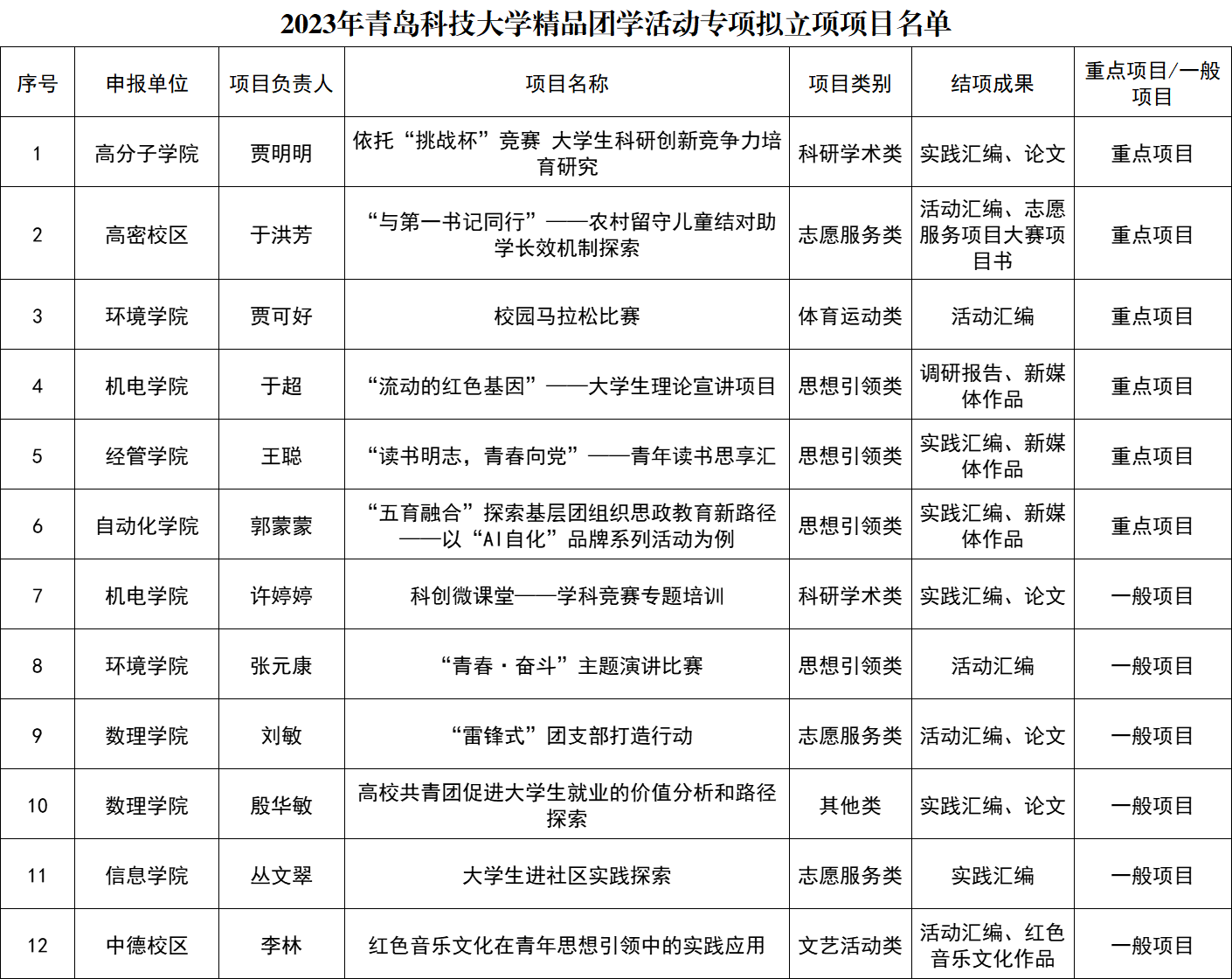 2023年上半年精品团学活动立项评审工作已经结束,校团委现对拟立项名单予以公示。本次立项,拟立项12项,含重点项目6项、一般项目6项,分别拨付2000元(重点项目)、1000元(一般项目)活动经费,结项时间为2023年底,2023年9月份将启动新一轮立项工作。