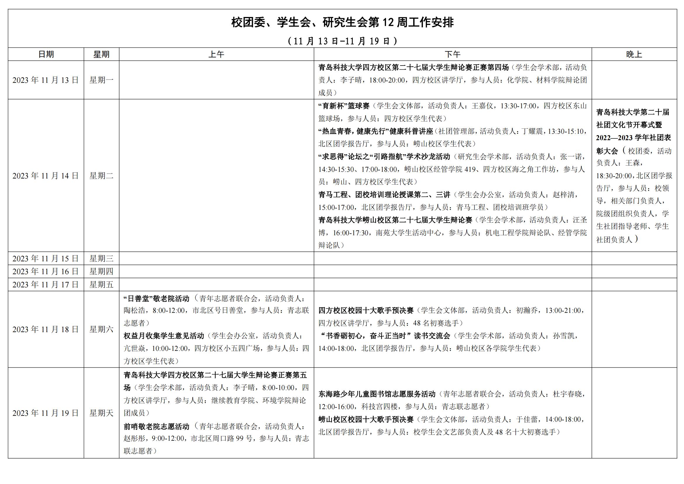 校团委、学生会、研究生会第12周工作安排