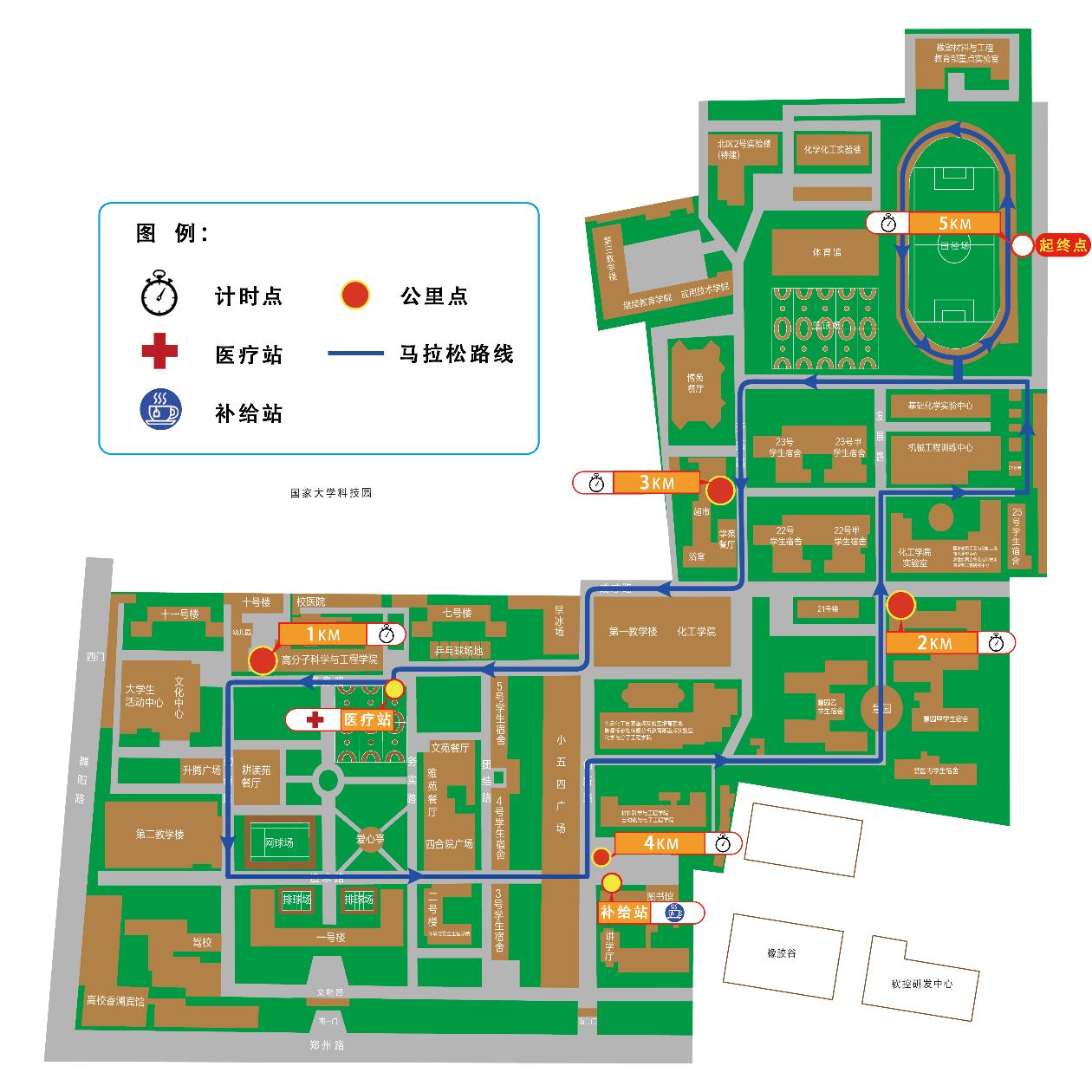 东山操场主席台——操场门口——博苑餐厅门前——学苑餐厅——轮滑场——高分子楼前——二教东侧——四合院广场——小五四广场——化学与分子工程学院——48台阶——26号楼——23号甲宿舍—机械工程训练中心—25号学生宿舍-操场门口——东山操场主席台。此路程为2.5公里。5公里绕路线2圈。