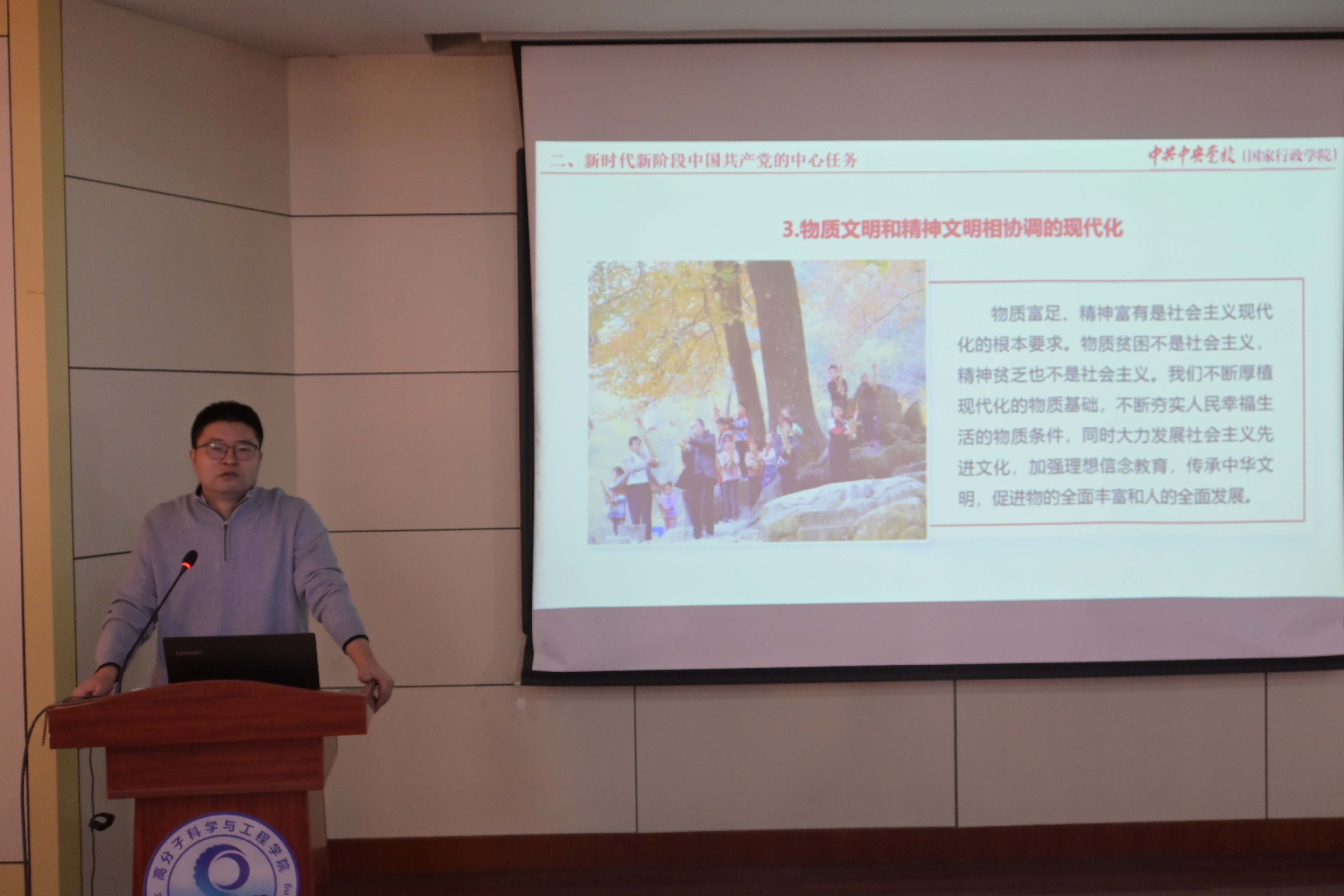 学校马克思主义学院马克思主义基本原理教研室副主任、高分子科学与工程学院兼职辅导员刘林作“中国式现代化的哲学蕴含”专题宣讲。中国式现代化是党的二十大报告中一项重大的理论创新成果,刘林紧紧围绕党的二十大报告,聚焦主题,凸显亮点,重点从理论阐述和理论逻辑两个方面对“中国式现代化”的特征、内涵、战略安排及多样性的统一进行了解读。中国式现代化,是中国共产党领导的社会主义现代化,既有各国现代化的共同特征,更有基于自己国情的中国特色。中国式现代化是人口规模巨大的现代化,是全体人民共同富裕的现代化,是物质文明和精神文明相协调的现代化,是人与自然和谐共生的现代化,是走和平发展道路的现代化。