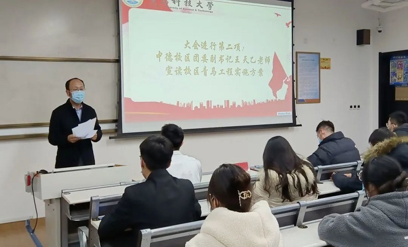 团委副书记王天乙老师宣读中德校区《青年马克思主义者培养工程》实施方案,要求校区青马工程全体学员,增强“四个意识”、坚定“四个自信”、做到“两个维护”,用党的先进理论思想武装自己,提升自身思想政治素质、理论水平、创新能力和实践能力,成为对党忠诚、信仰坚定、素质优良、作风过硬的高校青年政治骨干。