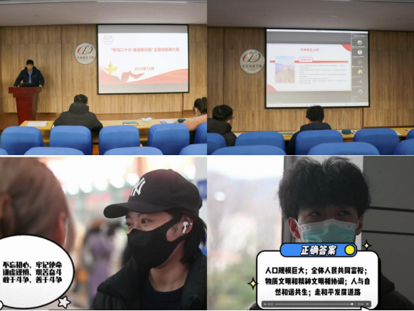 创新形式,走深走实。12月13日,学院团委组织开展团支部书记讲团课复赛,充分发挥团支部书记的“领头雁”作用,引导团支部书记先学一步、深学一层,在学中赛,赛中学,充分担当凝聚团员青年坚定不移听党话、跟党走思想共识的责任,在广大青年中激发怀抱梦想、脚踏实地的青春力量。开展党的二十大精神知识竞赛活动,内容涵盖党的二十大报告中的新目标、新举措,中国共产党章程,时事政治等多个方面,进一步引导团员青年领会精神实质,汲取开拓前进的强大勇气和力量。创造喜闻乐见的新形式,使党的二十大精神以“快问快答”的形式展现在同学们中间,带动广大学生积极性,促进全面学习、全面把握、全面落实,不断扩大党的二十大学习的深度和广度。