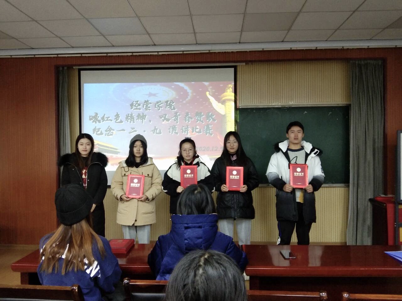 经管学院举办“咏红色精神,叹青春赞歌”主题演讲比赛,选手们分别以《85年后的回眸》《红旗飘飘》、《渴望光荣》、《我们这样爱国》、《我骄傲,我是中国人》等为主题,深刻缅怀了“一二·九”运动中革命先烈的英勇事迹,并将中国青年在抗战中的卓越成绩同自身发展、民族复兴和时代要求相结合,经管学院举办“咏红色精神,叹青春赞歌”主题演讲比赛,选手们分别以《85年后的回眸》《红旗飘飘》、《渴望光荣》、《我们这样爱国》、《我骄傲,我是中国人》等为主题,深刻缅怀了“一二·九”运动中革命先烈的英勇事迹,并将中国青年在抗战中的卓越成绩同自身发展、民族复兴和时代要求相结合,以“青春告白”涵育爱党爱国爱社会主义的真挚情感,以“固本培元”推动中共党史、新中国史、社会主义发展史教育入脑入心,加强“四史”教育的氛围营造和文化浸润,引导学生传承红色基因,勇做走在时代前面的奋进者、开拓者、奉献者,为实现伟大复兴的中国梦奉献智慧和力量。
