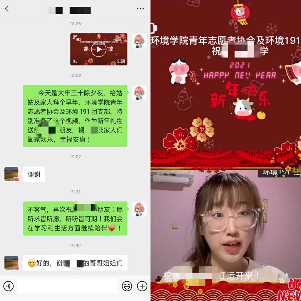 麟趾春深千岁酒,莺声日暖四时花。除夕当天,学院学生会、社管委将提前录制好的祝福视频发给陈同学家属,视频中学院对陈同学一家致以美好的新春祝福,并且祝愿陈同学在新的学期学业进步,健康成长。
