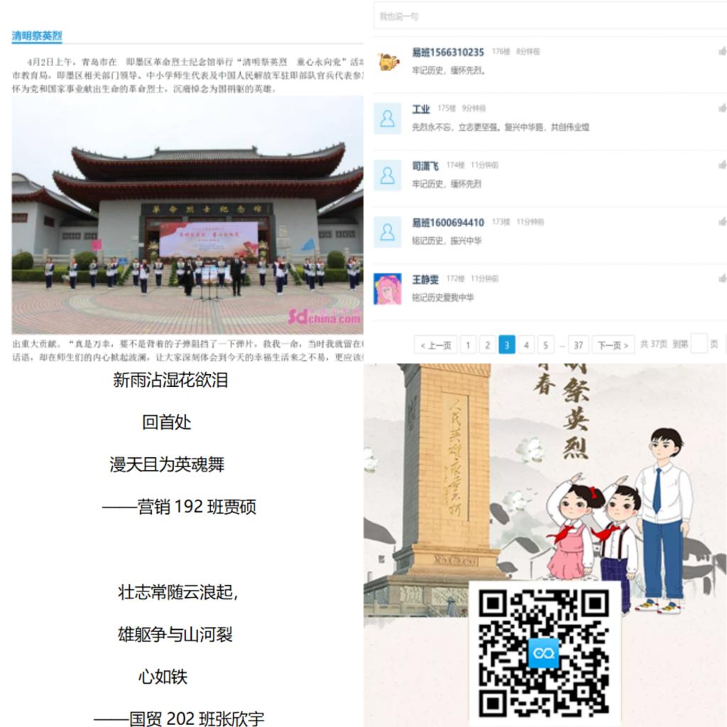 万里长空忠魂舞,英雄风骨尚凛然。当好英雄故事的传播者,不仅是对革命先烈的深切缅怀,也是对党史学习的深化。经管学院易班工作站于清明节来临之际发布快搭,鼓励同学们积极参与传统节日,网上祭英烈。此次活动帮助同学们更加了解清明节这一传统节日的演变和主要习俗,深入探讨了清明中承载的中华民族独特的精神与共同记忆,搭建了将党史学习教育和缅怀英烈相融合的桥梁。快搭中更设置了评论版块,为经管学子提供了抒发情感,寄托哀思的途径。同学们更是通过三行诗和网页H5的创作让红色种子在心灵深处生根发芽,用我们的初心使命解锁我们党“从哪里来”“向何处去”的精神密码。