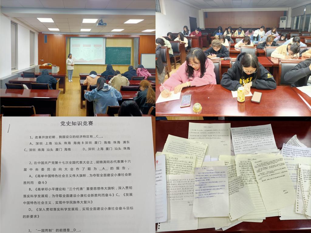 团支部举办党史知识竞赛,以赛促学,共同传承红色基因,凝聚奋进力量。整场知识竞赛涵盖了党史、新中国史、改革开放史、社会主义发展史“四史”内容,集知识性、教育性、趣味性于一体,充分调动同学们深入学习党的知识的动力。把党史知识和大学生思政教育结合起来,通过竞答鼓励同学们回顾红色历史,以史为鉴,承前启后,营造出同学们共同学习,共同提高的良好氛围。
