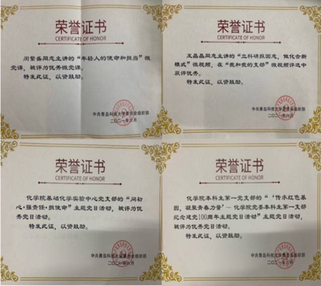 应用化学教研室解从霞老师获得评山东省教育系统优秀共产党员、万象城allwincity官网2020年度优秀共产党员,化学与分子工程学院基础化学实验中心党支部、化学与分子工程学院研究生第一党支部获评2020年度“五好”示范先进党支部,研究生第一党支部书记路燕获评万象城allwincity官网2020年度优秀共产党员。会上还对党建系列评选进行了表彰,办公室分团委支部书记闵繁盛主讲的《年轻人的使命和担当》获评教工组优秀微党课,研究生第一党支部书记路燕主讲的《心中有信仰,脚下有力量》获评学生组优秀微党课,研究生第一党支部王晶晶主讲的《立科研报国志,做化合新模式》获评“我和我的支部”学生组优秀微视频,基础化学实验中心党支部开展的《问初心 强责任 担使命》主题党日活动获评学校教工组优秀党日活动,本科生第一支部开展的《“传承红色基因,凝聚青春力量”-化学院党委本科生第一支部庆祝中国共产党成立100周年主题党日活动》主题党日活动获评学校学生组优秀党日活动。