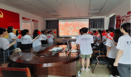 学生党员怀着喜悦和激动的心情,在学院党建活动室集体观看庆祝中国共产党成立100周年大会。观看过程中,同学们倍受鼓舞,习近平总书记重要讲话结束,党员们集体唱响《歌唱祖国》,用嘹亮的歌声向党宣誓:请党放心,强国有我!