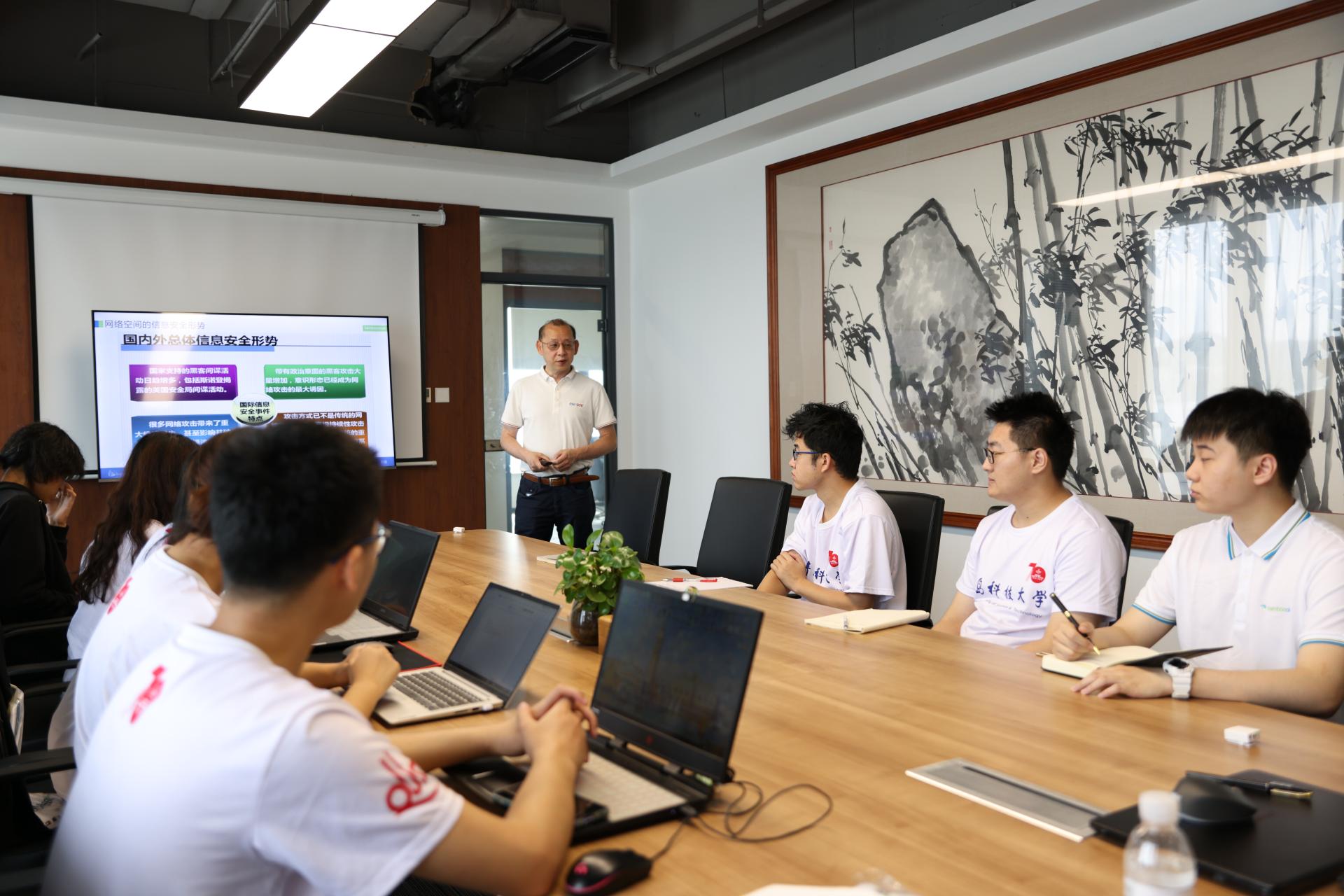 此次实践活动日程十分丰富,企业邀请了云安全联盟CSA大中华区主席、青岛竹云数字身份国际研究院院长李雨航和业内资深专家为实践队员们进行授课。李雨航院长进行了以“信息与网络安全产业概述”为主题的授课,对当前我国及世界信息与网络安全产业的现状与发展进行了详细介绍,并结合企业实例详细阐述说明了国内外网络安全的政策与态度。