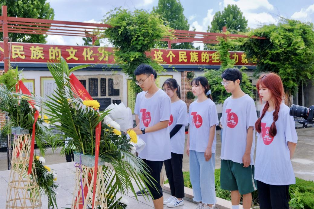 在前一天的充分学习感悟“浩然精神”后,2021年7月22日一早实践团成员怀着对烈士无限崇敬的心情,在周浩然文化园集合,踏入文化园,沉重庄严的气氛笼罩着大家。在园区联络人周海波女士的带领下,同学们有条不紊陆续来到周浩然塑像前,进行宣誓、默哀,献花圈等扫墓项目。巍峨的周浩然雕像,整洁的文化园,依墙摆放的花束,烘托出浓浓的缅怀氛围。怀着沉重吊唁的心情,实践团成员一个接一个的墓碑前,并深鞠三次躬以表深切的哀悼。虽感慨万分,此时却无声胜有声。