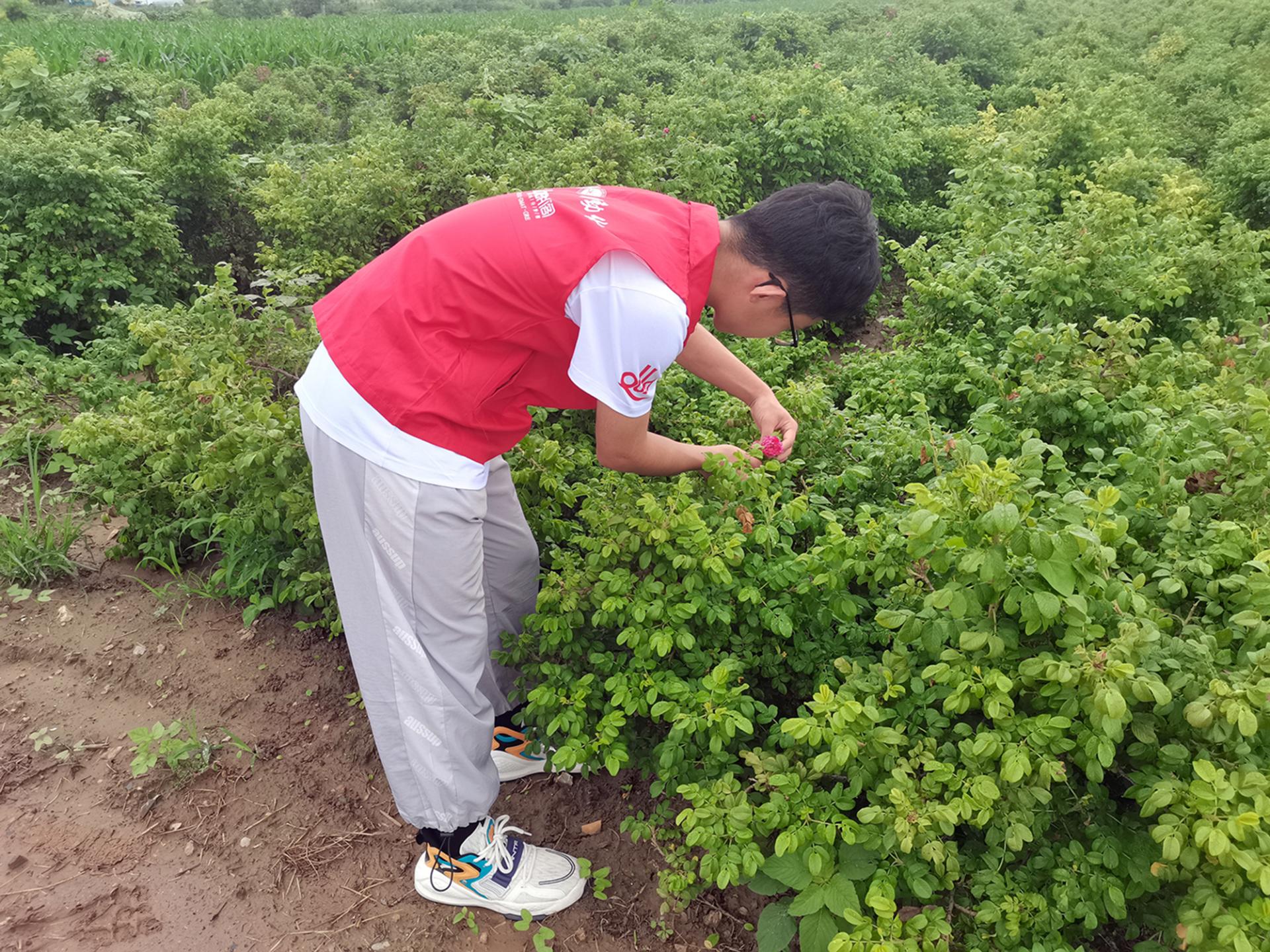 在工作人员的带领下,团队来到花苑种植基地,工作人员为团队成员讲解了关于玫瑰的栽培技术,对如何把芳蕾玫瑰花乡的玫瑰产品推向市场,进行简单讲述与分析。根据昨日与村支书张召元的交流,以及在南石硖村的实地参观、实践学习,团队成员亲身参与花卉栽培实践,帮助工作人员进行简单加工,学习体验平阴县特色玫瑰的加工流程。