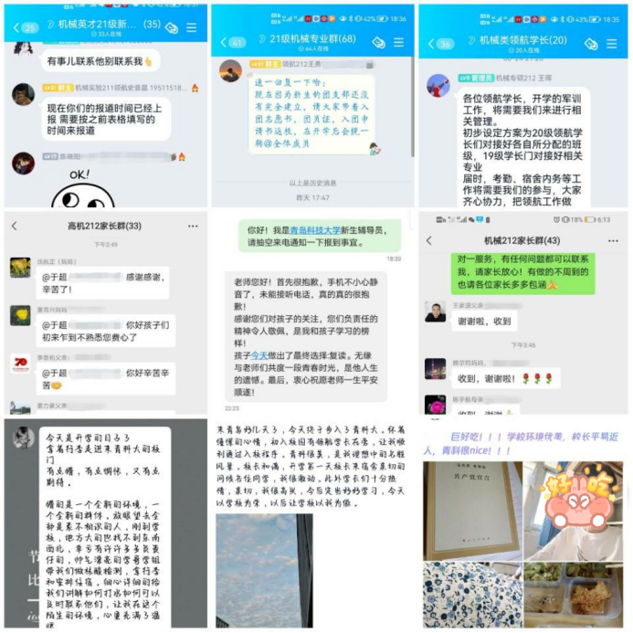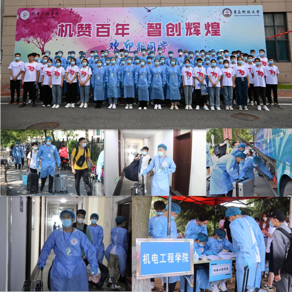 悉“心”培育,全面适应大学。学院将1068名学生在开学前两周完成100%对接,个别电话无法联系到的新生,通过多方途径联系到位。机电学院建立2021级官方新生年级群、专业群、班级群,就校园布局,教学楼、食堂、浴室、快递收发点等位置,科大美食,周边景区等进行答疑。提前摸排学生健康码、14天行程轨迹、疫苗接种率、核酸检测证明等信息。建立家长微信群,做好家校共育工作,学生进校后及时了解关注学生动态,做到让家长放心,让学生安心。今天刚到校的新生说:“自从录取结果出来之后,辅导员老师第一时间便与我取得了联系,专业群和班级群中发布了很多有关疫情防控期间返校的温馨提示,老师、学长一一解答。学长老师总是有问必答,给了我们很多学习成长的经验。”更有许多同学在朋友圈空间晒出来自学校无微不至的关怀,老师细心帮助的服务,为学校的疫情防控工作和老师们学长们用“心”服务点赞。能源214班刘禹京说:“太开心了!与校长合影了,感受到了学校老师对我们的关心和帮助。进入校园,我感受到了学校对疫情防控工作的严谨与认真,出示了健康码、核酸检测报告、录取通知书之后,身穿防护服贴有机电学院logo的学长就迎上来帮我搬运行李,学长十分热情,核酸检测井然有序,做完后乘坐摆渡车,进入宿舍看到桌子上有一本《苦难辉煌》,与同学们观看《开学第一课》《厉害了,我的国》”