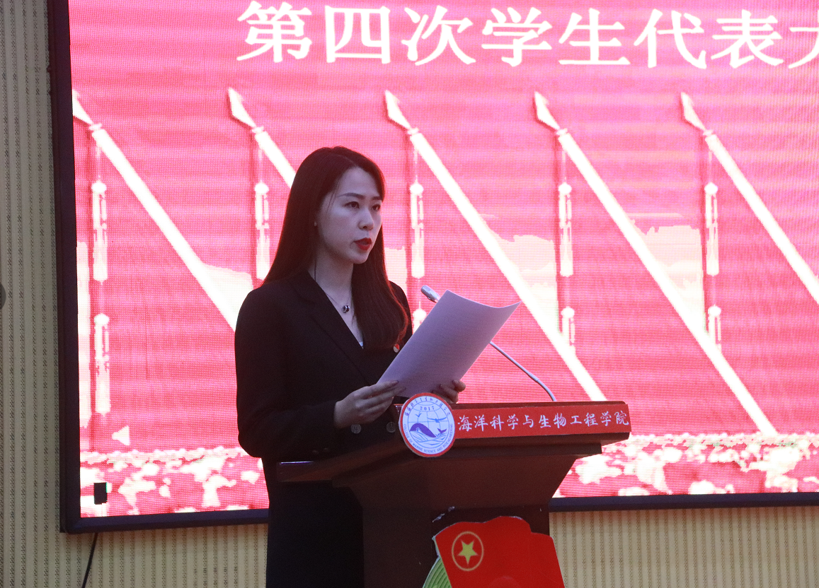 会上第三届学生会主席团代表靳羽欣同学作《坚定信念锐意进取实事求是勇于实践为实现“海洋强国”战略目标贡献“青科大海洋人”的青春智慧和力量》工作报告。