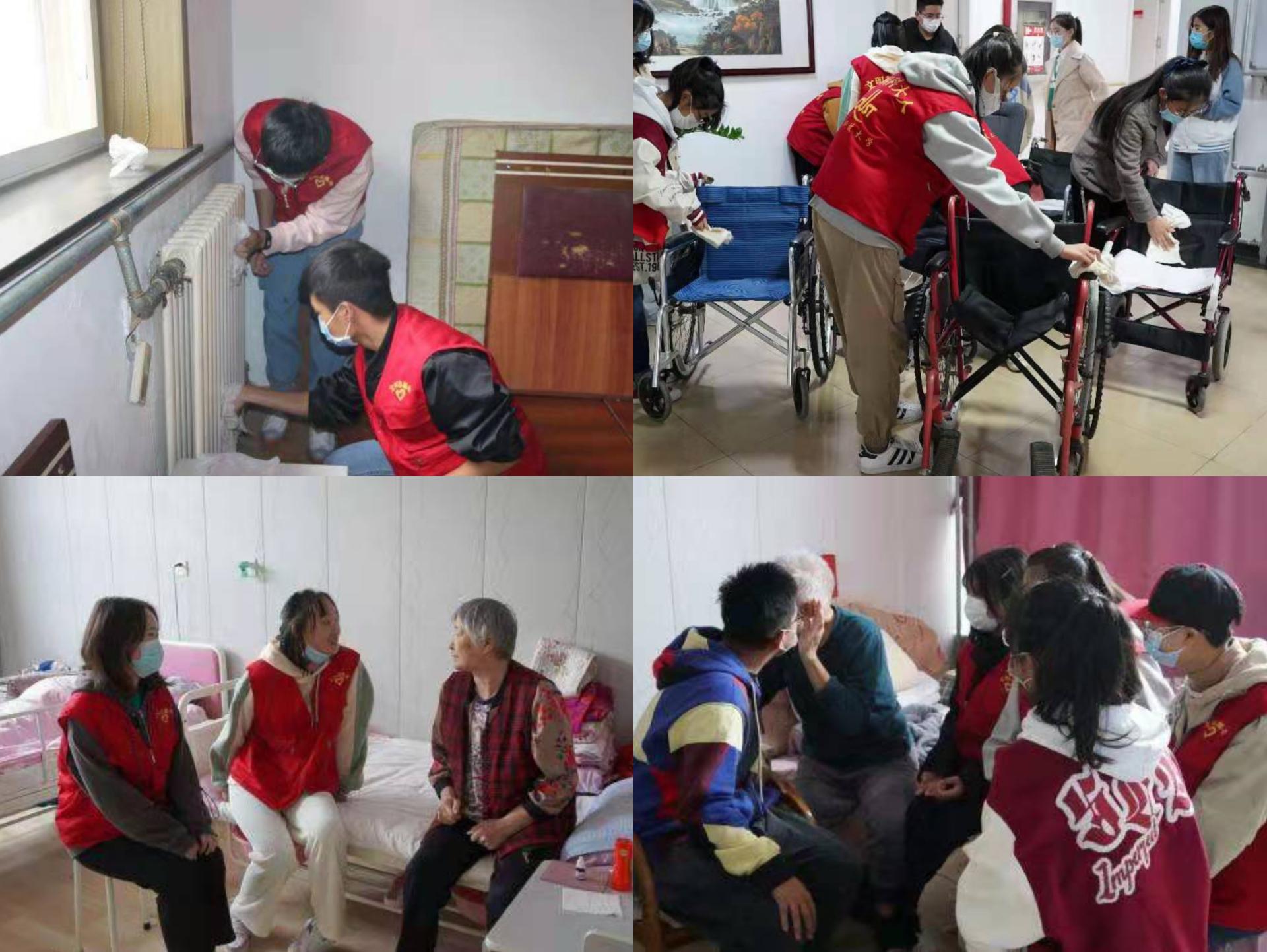 志愿行动,爱老敬老。天气的寒冷并没有影响志愿团同学们的热情,到达老年公寓以后同学们迅速明确各自的任务,第一项任务是擦轮椅。“两侧把手是老人最频繁接触的地方,需要重点消毒,多擦几遍。”在刘阿姨的指导下,从上到下,从左到右,同学们认认真真、仔仔细细,像一个真正的护工那样积极工作,其他护工看到了都纷纷称赞。还有的同学负责帮助打扫房间卫生,在供暖之前帮爷爷奶奶们擦拭暖气片。