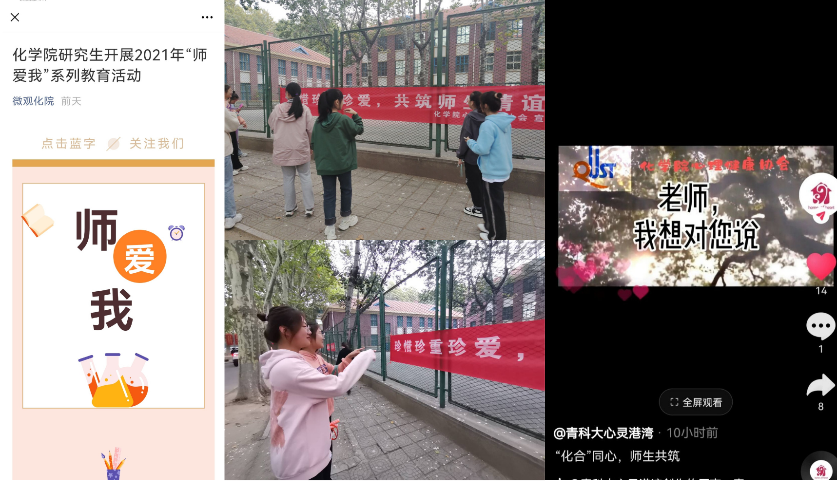 开展“师爱我”活动宣传。首先,面向全体同学进行了“老师我想对你说”主题短视频拍摄征集,获得同学们的积极参与,并在抖音平台进行投稿宣传,获得大量点击关注,引起热烈反响。同时,在校园内开展了师爱我活动横幅的张贴,并通过校园广播在当天开展师爱我相关内容的宣传,在微观化院公众号上进行师爱我活动以及心理健康知识的普及与介绍。