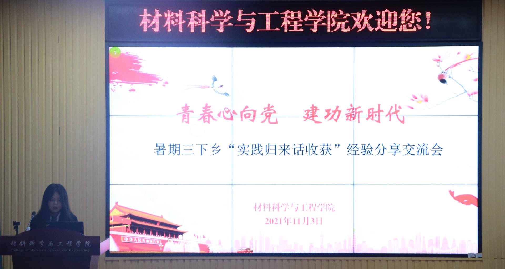 为深入学习贯彻习近平总书记关于青年工作的重要思想,积极响应团中央、团省委的有关通知精神,争当能够承担中华民族伟大复兴任务的时代新人,让2021级新生了解“三下乡”社会实践活动。11月3日晚,材料学院在学院楼101举办“青春心向党,建功新时代”暑期三下乡社会实践经验分享交流会。