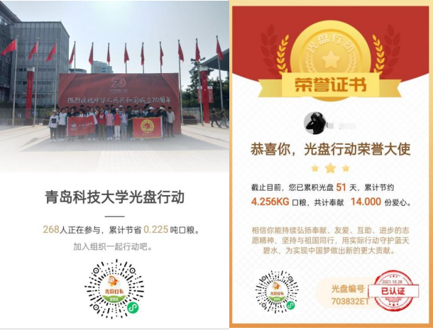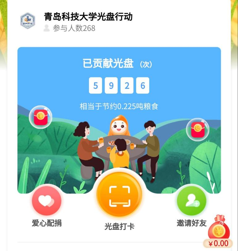 自2021年10月16日推出“光盘行动,你我同行一一30天打卡活动”以来,至今已逾半月,实现“光盘打卡”5926次,相当于节约了约0.225吨粮食。此次活动积极响应了在本次世界粮食日,联合国粮食及农业组织的呼吁:政府、国际组织、高校等社会各界需凝聚共识,采取行动,改变世界粮食生产和消费方式。