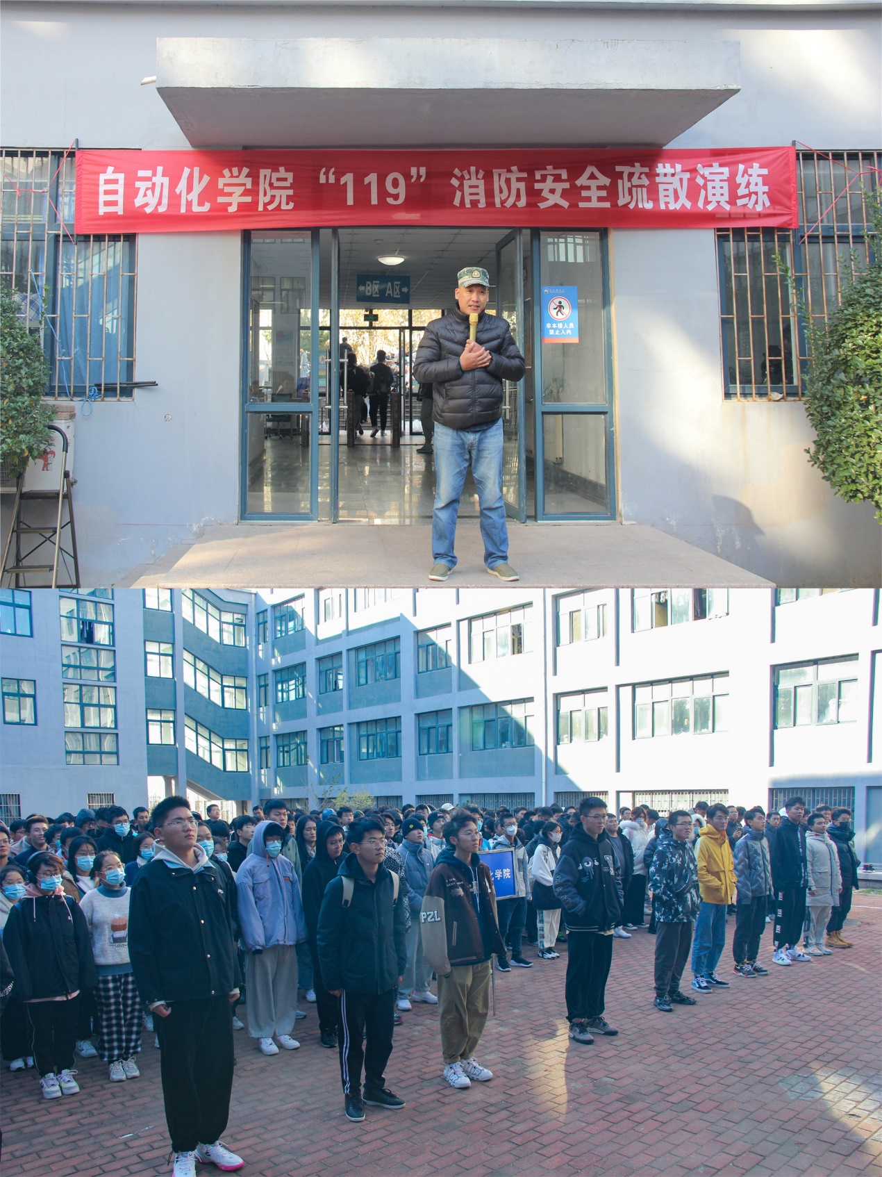 “119”消防安全疏散演练在北苑7号宿舍楼同步开展,保卫处消防科老师赵淑东,学院团委书记兼学工办主任郭蒙蒙,各年级辅导员以及21级全体学生参加活动。