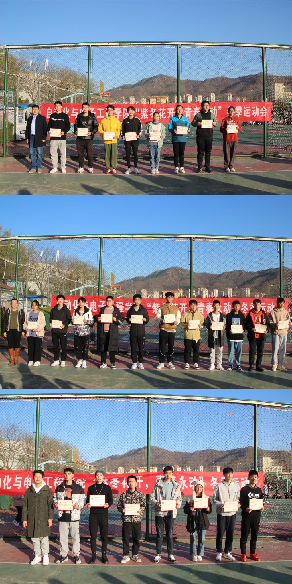 本届运动会上参赛选手们全力以赴,屡获佳绩。自动化学院党委副书记兼副院长马寒,团委书记兼学工办主任郭蒙蒙,团委老师张郁浩为取得优异成绩的运动员颁发奖状。
