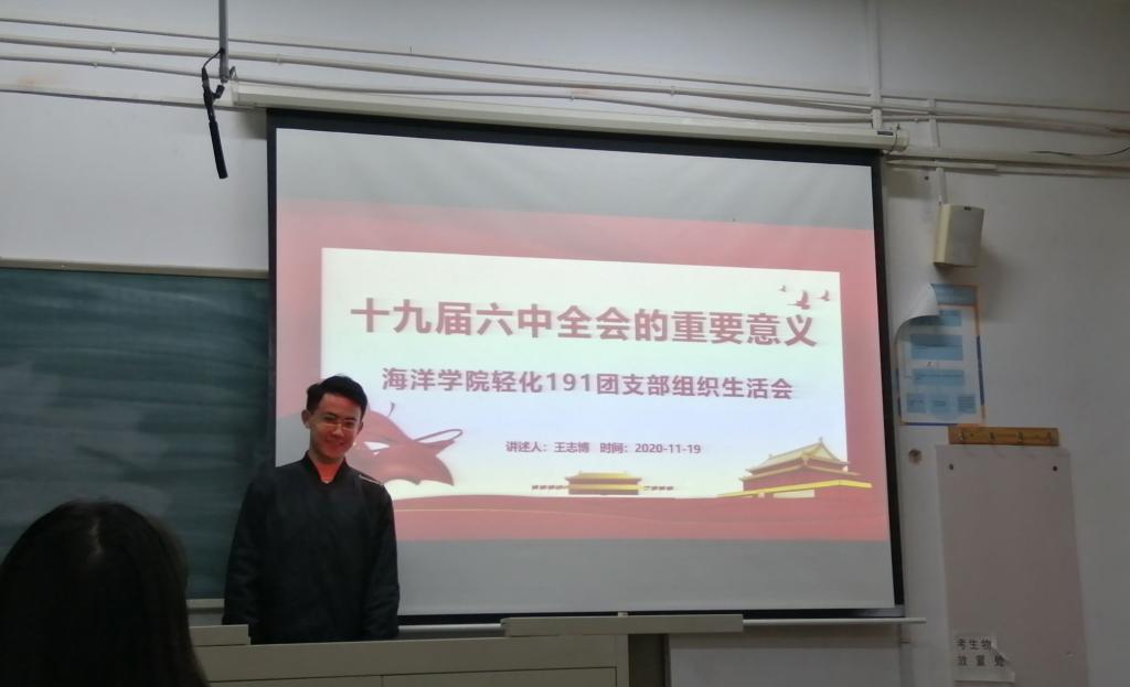 百年征程波澜壮阔,百年奋斗成就辉煌。11月19日下午,海洋科学与生物工程学院轻化191班全体同学于二教121组织开展“学习党的十九届六中全会内容及精神”主题团日活动。