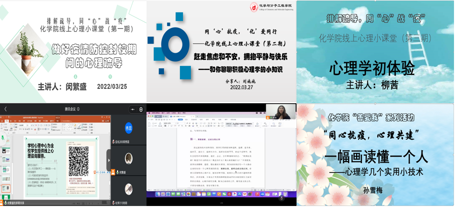 学院心理工作站组织联系组织围绕心理开展线上小课堂。化学院心理工作站站长闵繁盛讲授《疫情防控封校期间心理疏导指南和心理知识分享》,校心理课程授课老师刘施施讲授《赶走焦虑和不安,拥抱平静与快乐——和你聊聊积极心理学的小知识》,校心理咨询师孙雪梅讲授《一幅画读懂一个人——心理学几个实用小技术》,校外心理讲师围绕《心理学初体验》主题开讲,课堂受到学生喜爱,每次课堂参与学生超过150人。