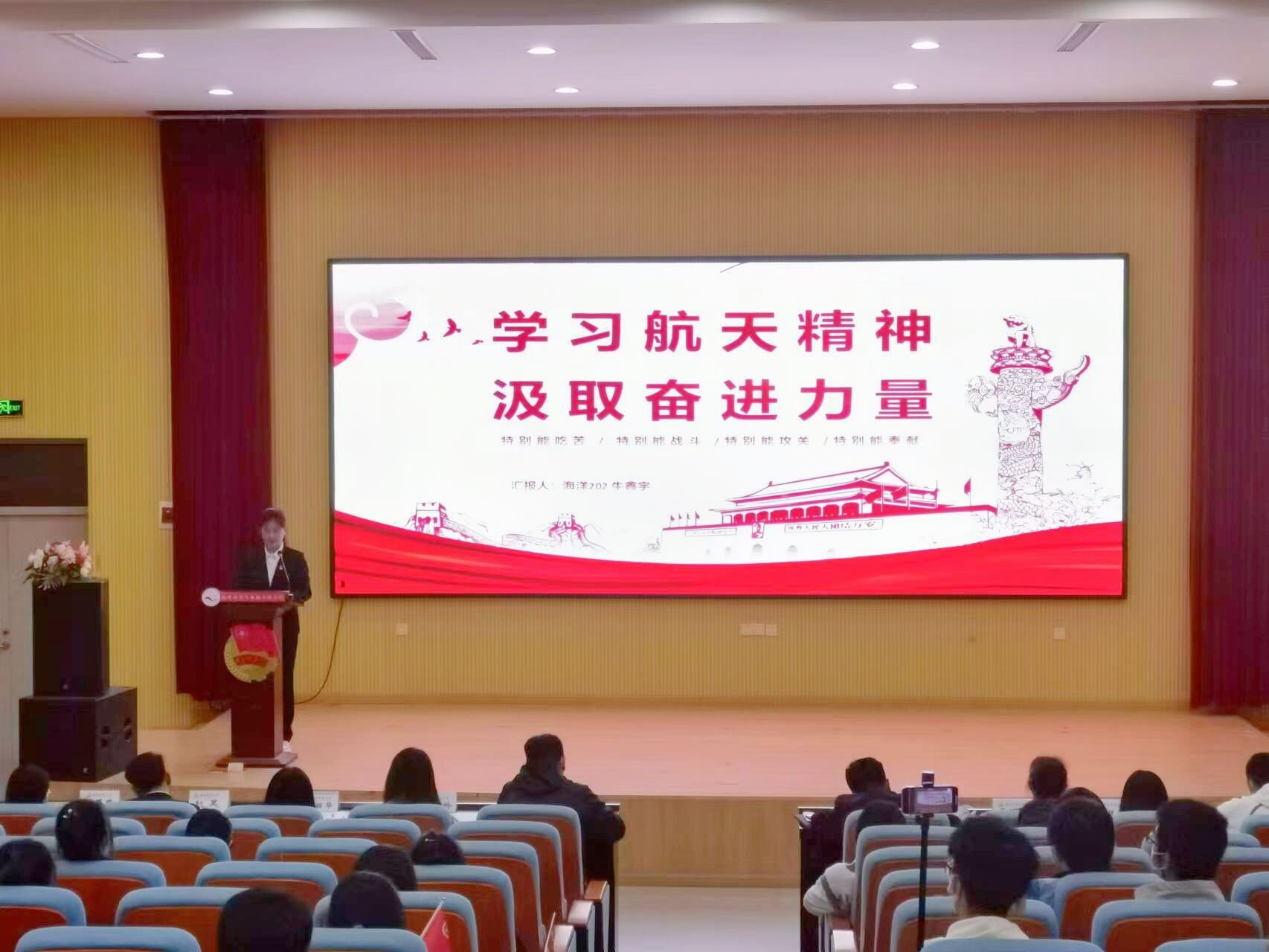 比赛在庄重的国歌声中拉开帷幕。参赛同学紧扣“喜迎二十大”这一主题,在内容上体现“微”,聚焦一个重大事件、一个伟大精神、一个伟大人物等,分别宣讲了“红船精神”“北斗精神”“载人航天精神”“抗美援朝精神”“抗疫精神”“遵义会议精神”等党的精神谱系重要内容。在形式上体现“活”,结合时代特色、青年特点,落实到青年学生思想、学习、工作实际,以价值引领为导向,弘扬正能量,传播好声音。比赛间隙,在场师生重温庆祝中国共产主义青年团成立100周年主题宣传片《共青春》主题曲《有我》,学习一代代青年先进分子在党的领导下,坚定理想信念,矢志奋斗,以青春热血铸就青春中国的光辉历程。团员青年们在最后用嘹亮的歌声合唱《共荣啊!中国共青团》彰显“请党放心,强国有我”的青春誓言,发出“清澈的爱,只为中国”的时代强音,展现“与党同心,青春建功”的青春朝气。