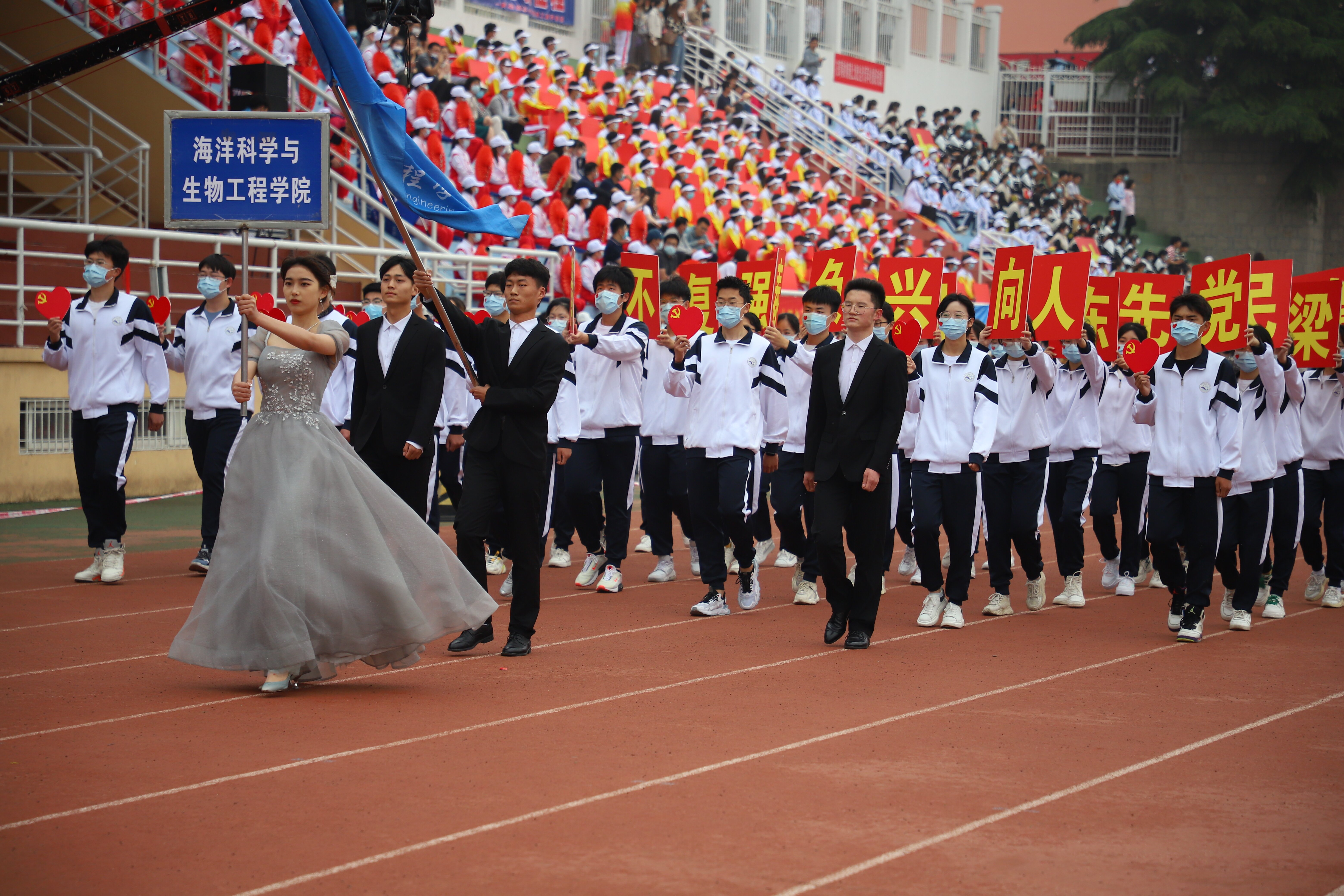 运动会开幕式在激昂的音乐声中拉开帷幕。海洋学院方阵队员身着统一的服装、迈着整齐的步伐、喊着嘹亮的口号、带着昂扬的气势,他们精神饱满、朝气蓬勃,海洋学子以积极向上的精神风貌展现出争做强国先锋、复兴栋梁的高昂赞歌。