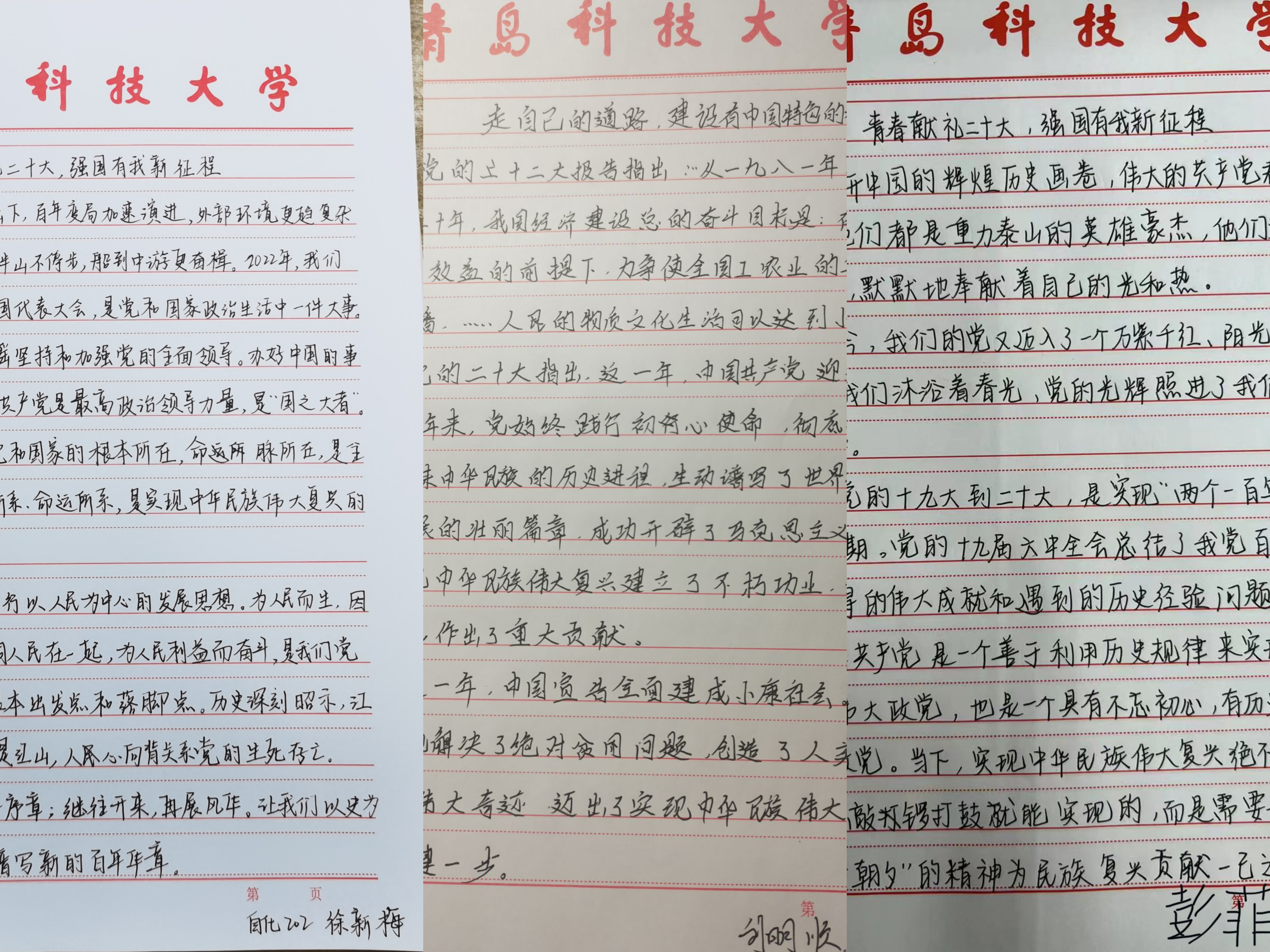 喜迎二十大青春著华章。自化202支部积极参与中国青年网组织开展的2022年“奋斗与成长”大学班级创意微文征集活动,鼓励大家通过青年人的视角讲述奋斗的故事。征文通知发出后,支部成员积极响应,团支部投稿率超90%,同学们纷纷用笔抒发自己的情怀,表达青年人对使命担当的思考。彭菲同学提到:如今,我们的党又迈入了一个万紫千红、阳光明媚的春天,我们沐浴着春光,党的光辉照进了我们每一个人的心中。正如李宇航同学感悟到:作为新一代青年,应当去传承先辈的爱国主义精神,将无数人的爱国之心化作一股引领我们前进的力量。书写二十大,展现强国风范。当代青年人应继续坚定理想信念,练就过硬本领,始终保持艰苦奋斗的前进姿态,在实现中华民族伟大复兴中国梦的新长征路上奋勇搏击,同时以勤恳奋斗、勇担责任的靓丽姿态和精神风貌喜迎党的二十大。请党放心,强国有我,感悟红色底蕴,我们在行动!