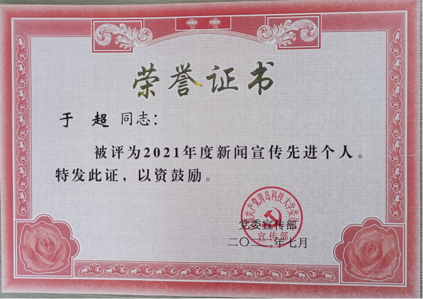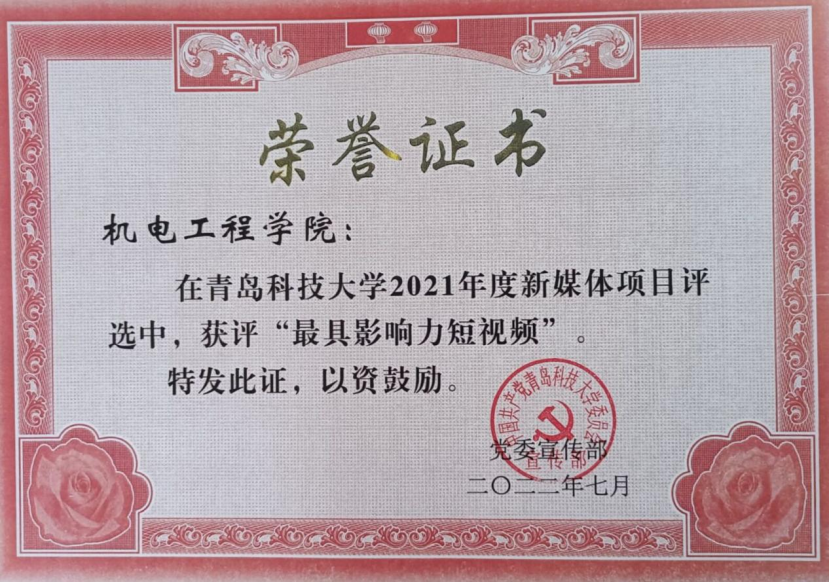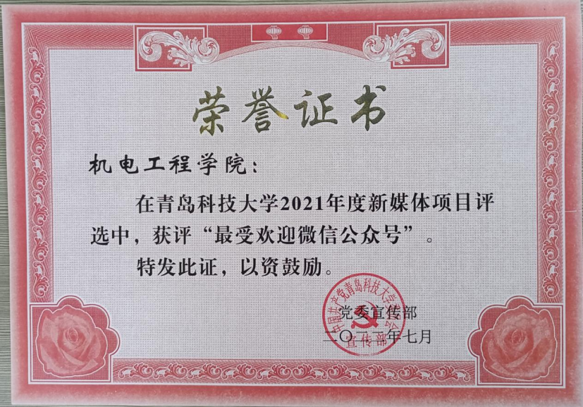 此外,学院在2021年度新媒体项目表彰中荣获多项荣誉。学院荣获2021年度新闻宣传先进单位,微信公众号“万象城allwincity官网机电工程学院”荣获2021年度最具影响力微信公众平台,新媒体项目评选中获评“最具影响力短视频”、“最佳原创微信推文”和“最受欢迎微信公众号”,于超获2021年度新闻宣传先进个人。