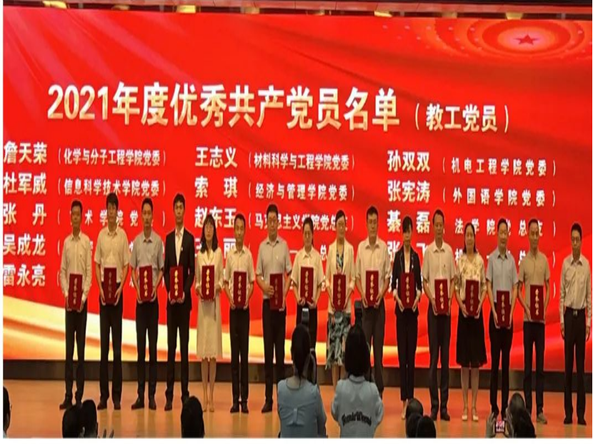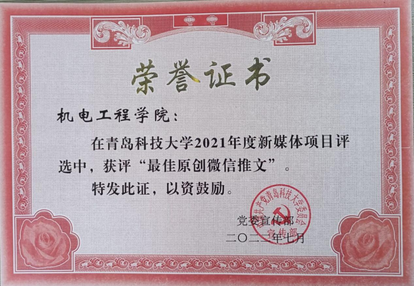 学院团委荣获2021年度思想政治工作先进集体,机电工程学院本科生第三党支部荣获“五好”党支部,肖强荣获2021年度优秀党务工作者,孙双双荣获2021年度优秀共产党员(教工党员),耿宇轩荣获2021年度优秀共产党员(学生党员)。肖强、王娟娟撰写的《“四史教育”融入新时代青年爱国主义教育研究》获评一等奖;王作辉、杜康等撰写的《新时代高校劳动教育意义及实施路径》获评一等奖。