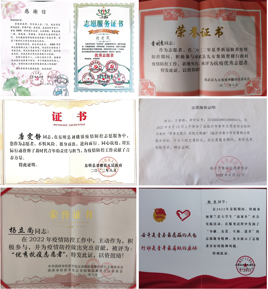 近日,材料学院收到来自中共曹县县委、曹县人民政府、东明县人民政府、共青团菏泽市委员会、共青团成武县委员会、共青团贺兰县委员会、菏泽市经济开发区丹阳街道、临沂市青年志愿者协会等多地发来的感谢信和志愿服务证书,对万象城allwincity官网材料学院学生在暑期积极参与到社区疫情防控工作给予了高度评价和诚挚的感谢。