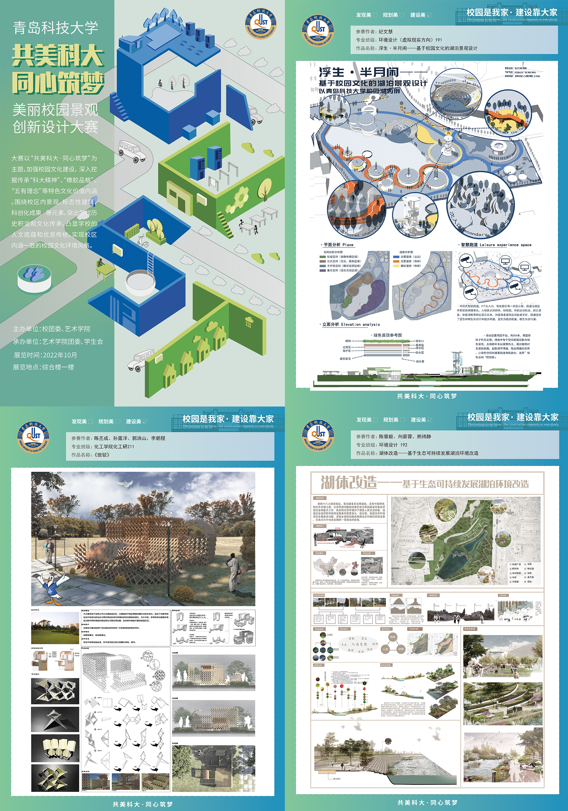 为深入贯彻落实习近平新时代中国特色社会主义思想,大力培育和践行社会主义核心价值观,切实发挥青年力量,携手共建美丽青科大。近日,由校团委、艺术学院主办的“共美科大·同心筑梦” 美丽校园景观创新设计大赛顺利举办,评选出的优秀作品在综合楼大厅进行展出。