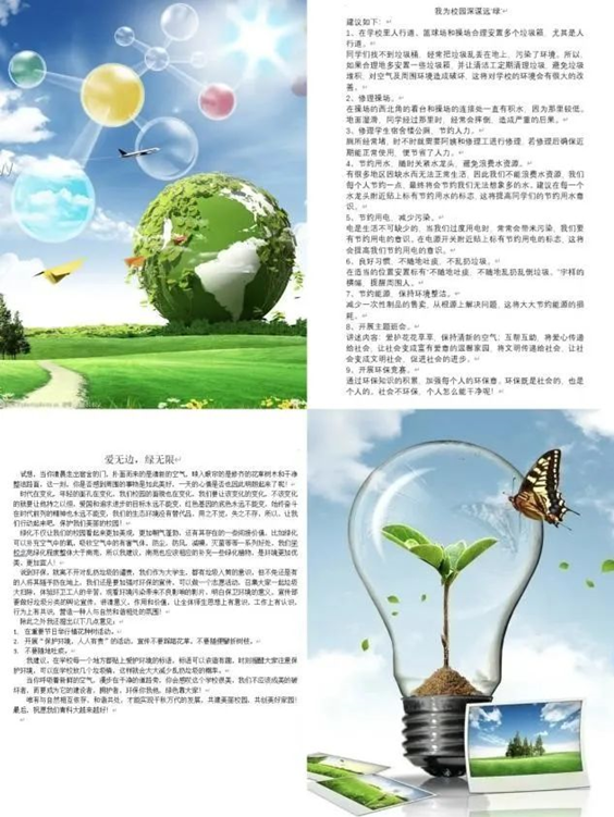 征文活动,“深谋远‘绿’”建言献策。提高环保意识,共建美丽校园。学院组织开展 “我为校园深谋远‘绿’”环保征文活动。同学们积极参与,结合身边绿色环保的鲜活事例,多角度分析如何建设美丽校园,为校园环保建言献策。本次活动提高了同学们对环保行动的重视程度,鼓励同学们争做绿色保护的倡议者。