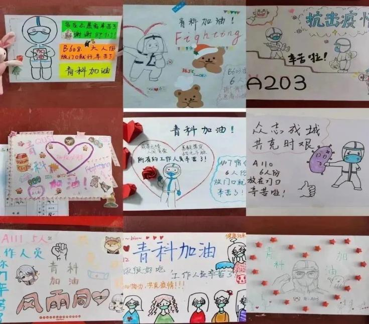 以“引领力”团结青年,坚定“战疫”信念提振精神。学院各临时“战疫”团支部组织青年学生相聚云端,共上一堂思政大课,共同观看《中国医生》、《我和我的祖国》、《最美逆行》等红色影片及防疫主题影片,深刻感受静默期间“何来岁月静好,只不过有人在替你负重前行”,引导团员青年们从抗疫事迹中汲取无私奉献、舍己为人,“功成不必在我,功成必定有我”的坚强信念与力量,增强了克服眼前困难、勇于战胜疫情的信心决心;陆续开展“共克时艰,战疫有我”、“疫情就是命令,防疫就是责任”等主题团日活动,呼吁大家在静默期间积极配合学校疫情防控工作,号召全体广大团员青年要坚决做到听党话、跟党走,把思想认识统一到习近平总书记关于疫情防控工作的重要指示精神和党中央决策部署上来,清醒认识当前疫情形势的严峻性和复杂性,理解、支持、配合学校的疫情防控政策,并动员团员青年们进行“共战疫情,强健体魄”健身活动,通过仰卧起坐、平板支撑、俯卧撑、深蹲、趣味乒乓球等体育活动养成健康的生活方式,以阳光乐观、积极向上的精神面貌应对此次疫情。在宿舍静默的同学们纷纷在门上粘贴感谢的话语,感谢在抗疫路上冲在前线的所有服务人员,并表示,如果组织需要,定积极投身学校疫情防控工作,用点点星火照亮青科战疫前行路。