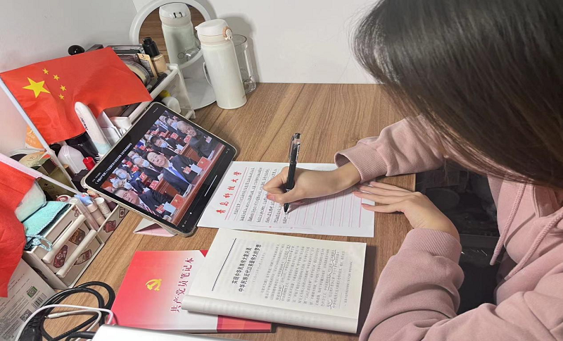以笔为马,感悟记心。“我们坚持每天抄写学习二十大报告,更深入全面的了解党和国家的各项方针政策。”在宣讲过后,材料CDC212班同学们说到。为了深入贯彻学习党的二十大精神,她们不光听,还认真写下来,查看她们的笔记,映入眼帘的是满满的学习感悟,反映了同学们更加积极的用党的理论知识武装头脑,积极进取。