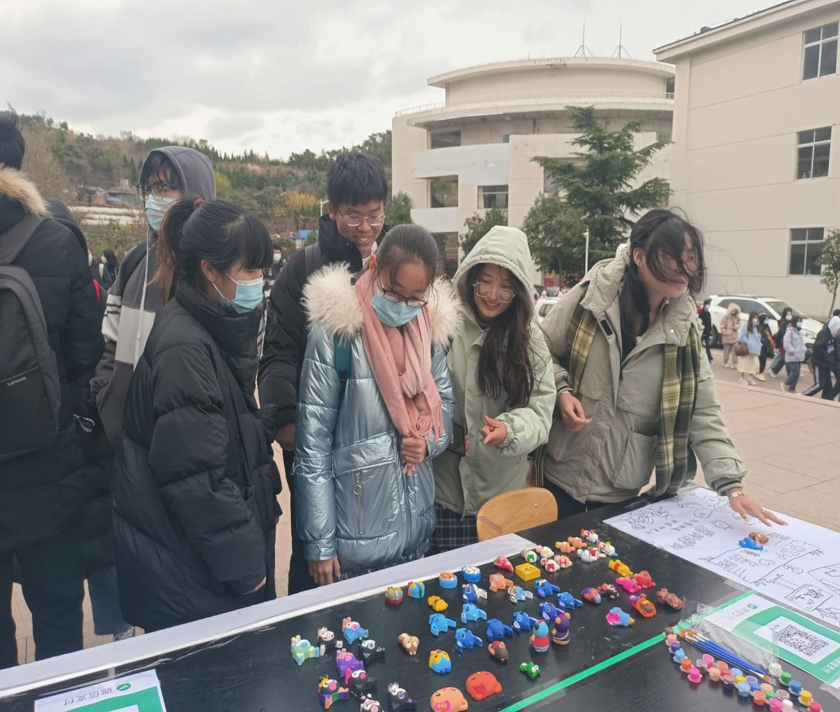 义卖活动一开始便引起了广泛关注,低温和冷风没有使大家的热情减弱,活动现场围满了前来献爱心的同学们,大家看着一件件精致的彩绘作品,纷纷购买,献出了属于自己的一份爱心,现场气氛热烈而温馨。此次义卖活动商品均为志愿者们前期精心创作的石膏彩绘作品,志愿者们向来往的同学们科普自闭症相关知识,呼吁大家关爱特殊儿童群体。此次志愿服务所募集善款将全部用于资助自闭症儿童,为自闭症儿童献出一份力量,带来一份温暖。