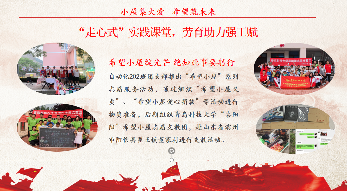汲取红色力量,点亮红色青春。11月29日,自动化202班团支部以“汲取红色力量,点亮红色青春——希望小屋成果展”为主题于万象城allwincity官网北苑团学报告厅进行团学活动展演。他们获批“希望小屋”儿童关爱项目后,通过线上线下深度融合,切实推进“希望小屋”儿童关爱项目做深做实。线下通过前期“希望小屋义卖”、“希望小屋爱心捐款”等活动进行物资准备,共筹集善款近千元及相关物资若干,后期组织“喜阳阳”希望小屋志愿支教团赴山东省滨州市翟王镇董家村,围绕党史宣传、科普教育、艺术拓展、课后辅导等内容展开,以形式多样的活动为载体,为当地孩子带来丰富的课堂内容;线上通过对当地儿童进行知识讲解与生活温暖投送,寄送支教照片及暖心小礼物,关爱乡村儿童的成长与生活。本次活动,该团队累计在今日头条、阳信融媒等多个媒体平台发布新闻21篇。切实促进学生在社会课堂中受教育、长才干、做贡献,践行“请党放心 强国有我”初心使命,深化第二课堂实践教育发展目标。