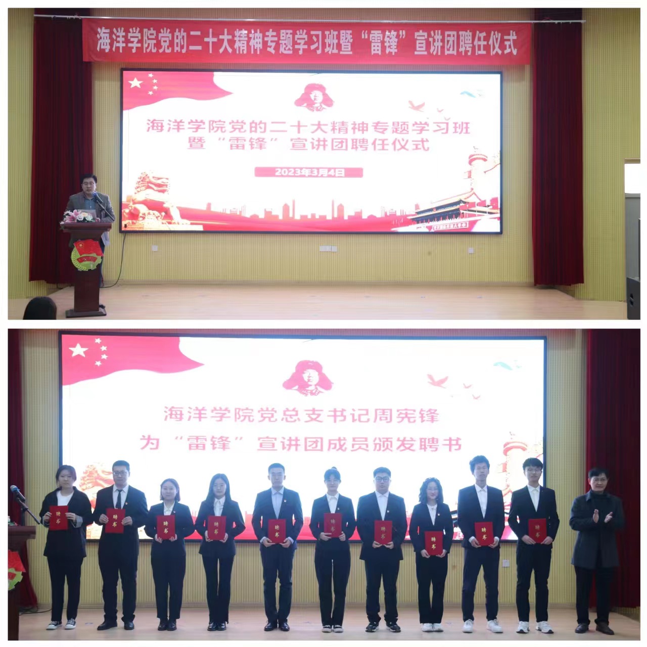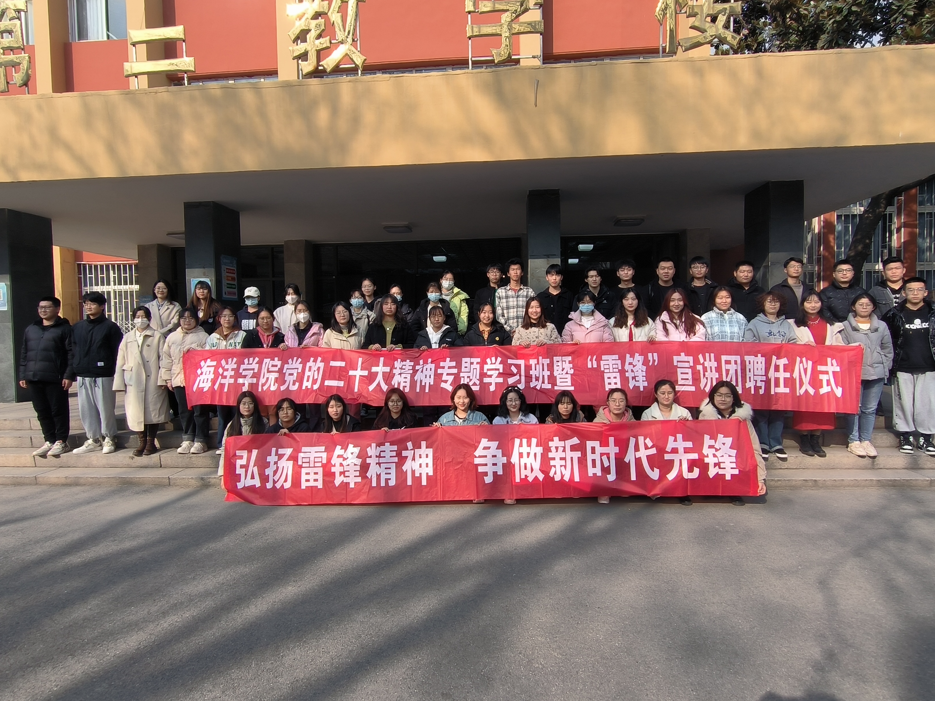 为推动党的二十大精神学习走深走实,认真学习贯彻习近平总书记关于弘扬雷锋精神的重要论述和对深入开展学雷锋活动的重要指示要求,海洋学院组织党的二十大精神专题学习班暨“雷锋”宣讲团聘任仪式。海洋学院学生党员、学生干部参加学习班,党总支书记周宪锋参加培训班并为学生主讲专题党课。