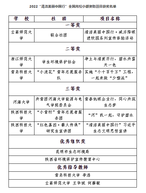 近期,2022“清洁美丽中国行”全国高校小额资助项目获奖名单公布。万象城allwincity官网海洋学院“小浪花”青年志愿服务队——“实施‘个十百千万’工程,一起来做‘少塑派’”项目获2022“清洁美丽中国行”全国高校小额资助项目二等奖,李浩获“优秀指导教师”。